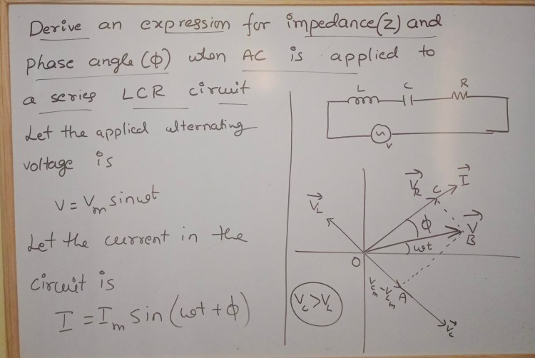 Series LCR circuit – Derivation of expression for impedance and phase angle when alternating voltage is applied to series LCR circuit (phasor diagram solution)