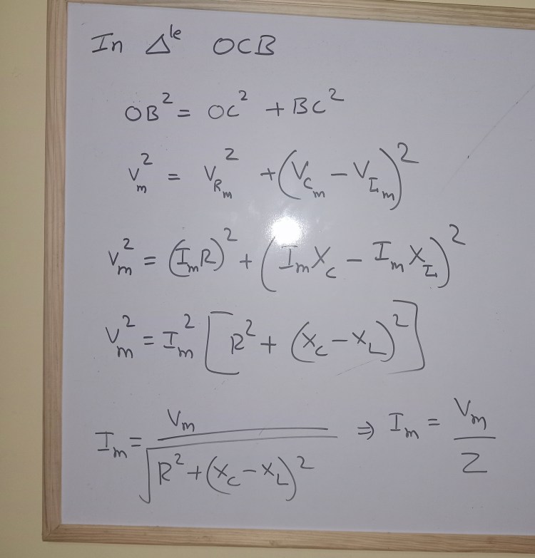 One thought on “Series LCR circuit – Derivation of expression for impedance and phase angle when alternating voltage is applied to series LCR circuit (phasor diagram solution)”